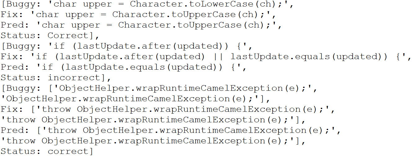 Among the two big datasets, there are 7009 bugs in the test sets in total. To make the results readable, we would like to use a snapshot to help understand our work more clearly. This snapshot includes three bugs among 7009 bugs in total. And two of them we can fix correctly.